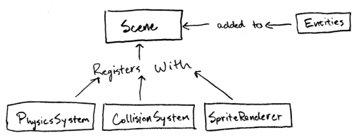 When the active scene is initialized, it registers systems to itself. As entities are added, either by the scene or by an external source, the scene distributes the entities to the appropriate systems based on what components the new entity has. Each system overrides a boolean method that determines what components are required on entities it controls. In this way, each system has no need to loop through entities it doesn’t care about, and the entities it does loop through are guaranteed to have the required components.